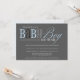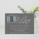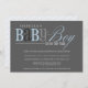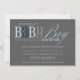 Barnkalasinbjudan med orden "baby boy" i blått, grått och svart med festsdetaljer nedan.