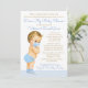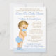 Drive by baby shower-inbjudan med söt blond baby pojke som bär en mask och söt blå outfit på en pastell blå och guld bakgrund. Denna söta drive by baby shower är lätt att anpassa för ditt evenemang genom att helt enkelt ändra texten. Du kan ändra textens färg, välja din typsnittsstil, formulering osv.