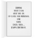 Det här söta kortet har ett foto av en baby-bunny sitta upprätt i gräset med hans tassar som hålls ut som om han är redo till ge en stor kram. Texten på framsidan säger: "En födelsedagshus för dig". Inuti budskapet står: "Förhoppning att jag snart kan ge dig en nära och personlig ge på riktigt" Du kan ändra texten inuti texten.