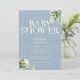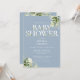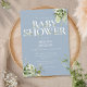 En elegant baby shower-inbjudan med elegant typografi och vacker botanisk grön flora på en dammig blå bakgrund. Designad av Thisisnotme