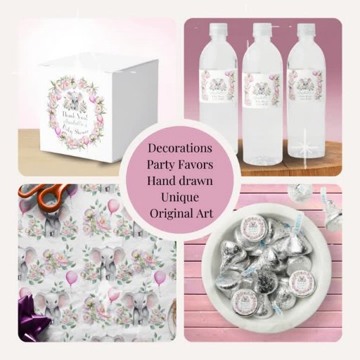 Den här charmerande, handritade illustrationen visar ett baby-elefant sitta bland känsliga peonier, ballonger och eukalyptus löv, som skapar en seren och vismisk atmosfär för din babydusch gynnar vatten-etiketter. Det här levereras med en fullt som samordnar uppsamlingen av babyduschar.