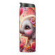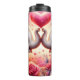 This enchanting digital illustration features two adorable, wide-eyed baby elephants facing each other, their trunks raised to frame a glowing pink heart. The elephants are rendered with soft, realistic textures and expressive brown eyes, adorned with delicate pink and orange flowers behind their ears. The scene is set against a dreamlike background of shimmering golden light and floating hearts, with the foreground filled with a dense thicket of blooming pink and red roses. This seamless-style graphic is designed as a full-wrap for insulated tumblers, providing a high-impact, 360-degree visual experience. The warm, romantic color palette and whimsical character design make it an ideal gift for anniversaries, Valentine Day, or as a charming accessory for animal lovers.
