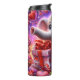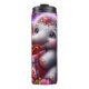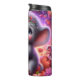 This enchanting digital illustration features an adorable, wide-eyed baby elephant holding a beautifully wrapped Valentine gift box. The elephant is rendered with soft, fuzzy textures and expressive blue eyes, wearing a delicate floral crown adorned with glowing hearts. The surrounding scene is a magical explosion of vibrant purple and pink tones, filled with shimmering stardust, floating hearts, and lush blooming roses. This seamless-style graphic is designed as a full-wrap for insulated tumblers, offering a high-impact, 360-degree visual experience. The whimsical character design and rich, cosmic-inspired color palette make it a perfect gift for Valentine Day, birthdays, or for any animal lover who appreciates a touch of fantasy.