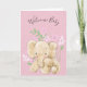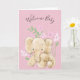 Cute elephant med rosa blommor på rosa och vit polka punktbakgrund för nya grattisar vid födseln Text är redigerbar.