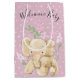 Cute elephant med rosa blommor på polkpunktens bakgrund. Bakgrunden till färg kan ändras. Text kan redigeras.