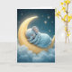 En baby blue elefant som är inslagen i en mysigt blå filt vilar på ett glättande måne, omgivet av fluffa moln och tvillingstjärnor. All text kan ändras.