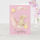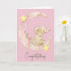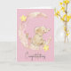 Cute-baby-elefanten sitta på ett rosa krescerande måne med blommor, stjärnor och guld glitter i en vattenfärgsdesign för nyfödd bebis grattisar.