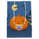 Baby Halloween-pumpa med nappar. En död träd, en läskig mansion, några fladdermöss och måne ses i bakgrunden.