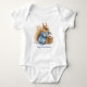 Den vackra juldräkten en biet har en söt ekorre med blå julklapp som öppnar en gåva. Nedan står texten med texten "Baby First jul" i ett blått kursivt teckensnitt.