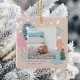 Elegant och vackert baby, första julen, förblir ornament. Magisk och vismisk tvåsidig utsmyckning av baby-fotot Julgran. Utformningen har vår handritade chic pastel färg Julgranar, fallande vitt snöflingor och duvor. Det mjuka pastellet färg väcker ett budskap om hopp, glädje och fred. "Första julen" placeras över bildplatshållaren och personligen med året och baby namn. Alla teckningar är handritade originalteckningar i Moodthology Papery.
