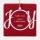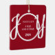 Den här nyckelfiguren Baby Första julprydnaden dekoreras med ord JOY i snyggt skripttypografi på röd bakgrund. Enkelt anpassade.