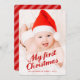 En modern "första jul"-hälsning är framtill och mitt i den här designen som innehåller kursiv text på en vismisk vinkel för ett vackert utseende som du säkert vill ha. Skicka avslappnad contemporary hälsning till familj och vänner med en stor storlek bild av din lilla på framsidan och ett trendig som samordnar helgdag godis-käpp strimlade mönster på baksidan.