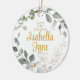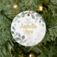 Fira baby första jul med denna vackra prydnadsartikel som kan anpassas med namn eller år. Eucalyptus i guld och grönt är en vacker design som är underbar för alla flickor och pojkar. Du kan ändra teckensnitt och färg på namn och datum. Det här är en underbar gåva till en babydusch eller nyfödd bebis.