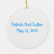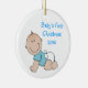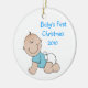 Rundajulgranprydnad, med tecknaddiagram av en pojke. Blåtttext beklär på läser baby första jul 2010. Personifiera texten på baksidaen av prydnaden med din bebis namn, och födelse daterar. Den underbara bebis gör den första julprydnaden, och en söt gåva för.