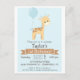 Baby giraffe med ballong, djungel, djurparker, neutralt av safari-temat, pojke eller flicka födelsedagsfest inbjudan. Känn inbjudan med ditt barns namn. Ljusare, enkel, enkel design. Perfekt för baby först, 1:a, födelsedag, småbarn, små barn eller äldre barn. Färg omfattar pastellblått och brunt.