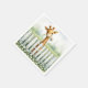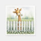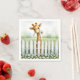 En lekfull giraffe som söker över ett vitt betesstaket med en daisy i munnen.