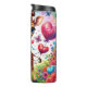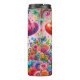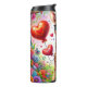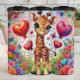 This enchanting digital illustration features an adorable baby giraffe with large, expressive blue eyes standing in a vibrant meadow. The giraffe is surrounded by four ornate, heart-shaped balloons in shades of red and pink, each tethered with delicate strings. The lush foreground is filled with a dense variety of colorful wildflowers including daisies and roses, while whimsical butterflies flutter through the bright, airy background. This seamless-style graphic is designed as a full-wrap for insulated tumblers, providing a high-impact, 360-degree visual experience. The cheerful color palette and playful character design make it an ideal gift for Valentine Day, spring birthdays, or as a charming accessory for wildlife enthusiasts who love a touch of fantasy.