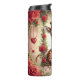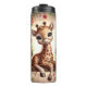 This enchanting digital illustration features an adorable baby giraffe with large, expressive eyes sitting gracefully on a decorative swing. The swing is intricately adorned with lush red roses and delicate green vines, suspended by golden chains featuring hanging heart ornaments. The background is bathed in a soft, ethereal glow, creating a romantic and whimsical atmosphere perfect for a holiday celebration. Deep red roses frame the entire scene, adding depth and a classic touch to the composition. This seamless-style graphic is designed as a full-wrap for insulated tumblers, providing a high-impact, 360-degree visual experience. The warm tones and charming animal subject make it an ideal gift for Valentine Day, anniversaries, or for any wildlife enthusiast who appreciates a touch of fantasy.