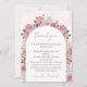 Den här chicen av elegant-blommigt har visningar av rosa och vita blommor som formar en modern bågdesign. Rosa-skript kombineras med grönt serif typsnitt. Gästerna är säkra på att kärlek får dessa hjärtliga tackkort i posten, perfekt för babyduschar, födelsedagsfester, möhippor och baptismer. Anpassadet är helt och hållet och det är enkelt att anpassa texten till alla tillfälle.