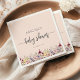 En vacker vattenfärgsfärgad blommigt gräns av vilda blommor dekorerar grund kant i det här trendiget boho babyduschnapkin. Orden "babydusch" visas i skriptteckensnitt, med dekorationer före och efter skriptet. Anpassa texten med namn i den serif-text som ska finnas i serif och datumet i sans serif charcol grått text på rosa.