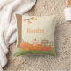 En personlig kudde med en illustration av en söt liten baby som vilar i en urgröpt pumpa bland pumpafältet. Perfekt som dekorativt stycke för ett hösttematiskt rum i barnkammaren. Ett mönster av pumpa och löv på baksidan.