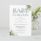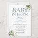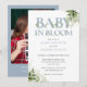 Baby in bloom bebis shower inbjudan med elegant dammig blå typografi och vacker botanisk grönska bladverk och ditt speciella foto på baksidan. Designad av Thisisnotme