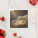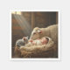 Ett baby sover fredligt i ett torkat basket vid sidan av en fluffy grått kitten och ett får i en varm, solbelyst lada
