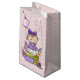 Söt flicka sitter på en hög med gåvor. Bakgrunden är ljus rosa med mörkare rosa polka dots. Text färg matchar punkterna. Underbar i ett år gammal underbar barndotter, men kan anpassas efter relation och ålder.