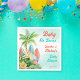 Baby ombord på tropisk surfning på stranddusch för babyduschar personlig party. Handflatan träd, surfor, tropiska växter, återinför strand, surfning, tropiska temerade babyduschar.