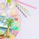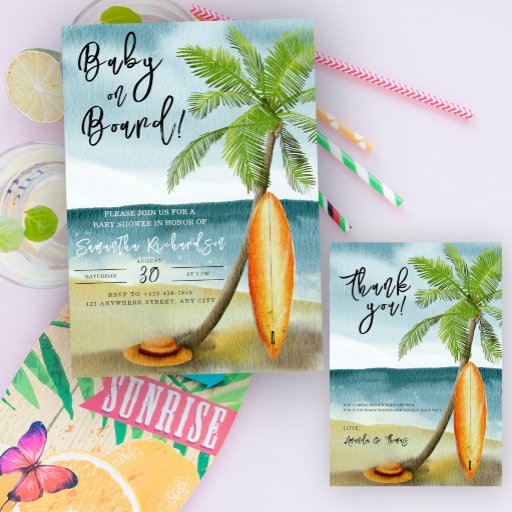 Baby ombord! Babyduschinbjudan - perfekt till en sommardusch. Kultema. Vattenfärgskonstruktionen har en havs- och strandscen med ytbord, handflatan träd och sommarhatt.