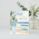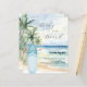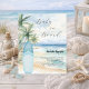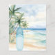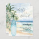 En elegant inbjudan till en Baby Shower, som firar en babypojke. En akvarellmålad sandstrand, havsvågor och palmer som bakgrund, och en blå surfbräda på stranden.