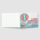 Guest book for baby shower features cute cub in a hot air balloon flying over the clouds.