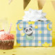 Cute baby panda med en ljus gult måne och stjärnor på en blå gingham mönster.