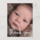 Personlig med babyen på framsidan och speciellt meddelande på baksidan. Den här designen användor ett handritat elegant-skriptteckensnitt, vilket ger en aning sofistikering. Övertäckningen "Tack" från ord finns i ett modernt vitt teckensnitt. Jag vill uttrycka er upprördhet över att meddela ditt barns födelse och samtidigt framföra er tacksamhet. Inkludera baby födelsedatum och status.