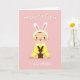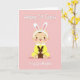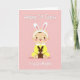 This card shows a sweet cartoon baby centered on a soft blush-pink background, looking forward with big shining eyes and rosy cheeks that suggest a gentle, affectionate mood. A headband with tall white bunny ears and pale pink inner details adds a springtime touch 🐰. The baby wears a sunny yellow one-piece with a white collar, and the close, careful pose feels like a small gesture of friendship. Held snug against the chest is a simple dark-brown plush rabbit-like toy, as if it’s being hugged for comfort 🐇. The design stays uncluttered so the baby and toy feel like the whole scene, with the warm pastel colors doing most of the storytelling. Text appears both above and below the baby in a thin, flowing style, set in a dark tone that stands out clearly against the pink. The baby’s little foot coverings include light pink circular pads on the soles.