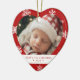 Commemorate a cherished milestone with this sweet and festive Baby’s First Christmas ornament. Designed in classic holiday style, this round photo ornament features a bold red background adorned with delicate white snowflakes, framing your little one’s photo in a heartwarming and memorable way.