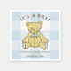 Den här söta babyduschservetten har en söt nalle med blå fluga. Bakgrunden är en ljusblå och vit buffelkontroll mönster. Texten på framsidan lyder: "Det är en pojke!" tillsammans med namn och barnduschen för att du ska kunna anpassa dig.