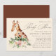 Tropiska babyduschinbjudningar med en vattenfärg i mamma och baby giraffe med elfenben och rosa hibiscus blommor med grönt löv och löv på gräddfärgadens bakgrund. "Baby Shower" visas i ett modernt kalligraphy-skript med information om babyduschen som visas nedan. Giraffe-babyduschen går tillbaka till en solid brun bakgrund med utrymme för text och/eller bilder.