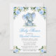 Vattenskärtad blå vit Blommigt Baby Elephant med Blue Bow Baby Shower-inbjudan. Omfattar vackert vattenfärgsblått ro, vita blommor och botaniskt grönt. Silver och blå text.