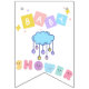 Denna flaggstång banner har orden "Baby Shower" i ett unikt tryck typsnitt med olika färgbokstäver med ett moln och regndroppar i detta stjärnor och djur tema. Alla banners har enkelsidig utskrift utomhus säkra gjorda med robust plast polystyren och tjock plast rep har (16) 5.5" x 8" swallowtail flaggor på en 6' lång sträng.