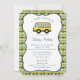 Skola buss-babyduschinbjudan med söt liten buss-design i gult, grönt och blått med registerinformation på baksidan.