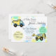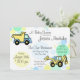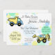 Mjuka babyblå, gröna och gula konfettipunkter och roliga byggfordon, baby shower-inbjudan. Ändra och lägg till text som önskat. Blå och gul dumper och baklastare är ett perfekt sätt att låta gästerna veta att det är en baby shower för en babypojke.