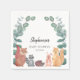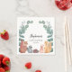 De här babyduschservetterna från trädjur är dekorerade med söta vattenfärgade skogsvänner och grönska. En räv, en mårkoon, en hedgehog, en kniv och en ekorre omges av rustik eukalyptus greenery. Enkelt anpassade. Ursprunglig vattenfärg © Michele Davies.
