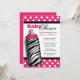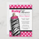 Stilfulla baby showerinbjudningar som är designade med vitpolka dots över shock rosa och att presentera en zebra tryckbebisflaska.