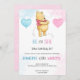 Baby shower invitation featuring a bear hugging a red heart balloon, with blue and pink accents. Text reads: "He or She, What Will Baby Be?"