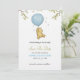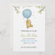"Baby shower invitation featuring a cute bear holding a blue balloon, surrounded by stars and leaves. Text reads: 'A little hunny is on the way!' and 'Save the Date for the baby shower of Sophia and Richard, Aug 12, 7 PM.'"
