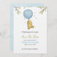 "Baby shower invitation featuring a cute bear holding a blue balloon, surrounded by stars and leaves. Text reads: 'A little hunny is on the way!' and 'Save the Date for the baby shower of Sophia and Richard, Aug 12, 7 PM.'"