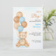 Baby shower invitation with a cute teddy bear holding blue and brown balloons. "It's a Boy!". Light blue and beige tones create a joyful ambiance.