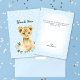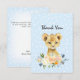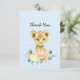 Tack till gästerna med den här söta, baby lejona unge med blommigt bouquet under, mjuk baby blue bakgrund och mjuka vita prickar. Mallar har tillhandahållits åt dig.