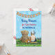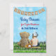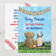 Sött barn och teddybjörn med basebollmössa, basebollhandske och baseboll och slagträ som sitter i gräset tillsammans vid en basebollplan. Det här är ett sött tema för en baby shower för pojkar på våren eller sommaren.